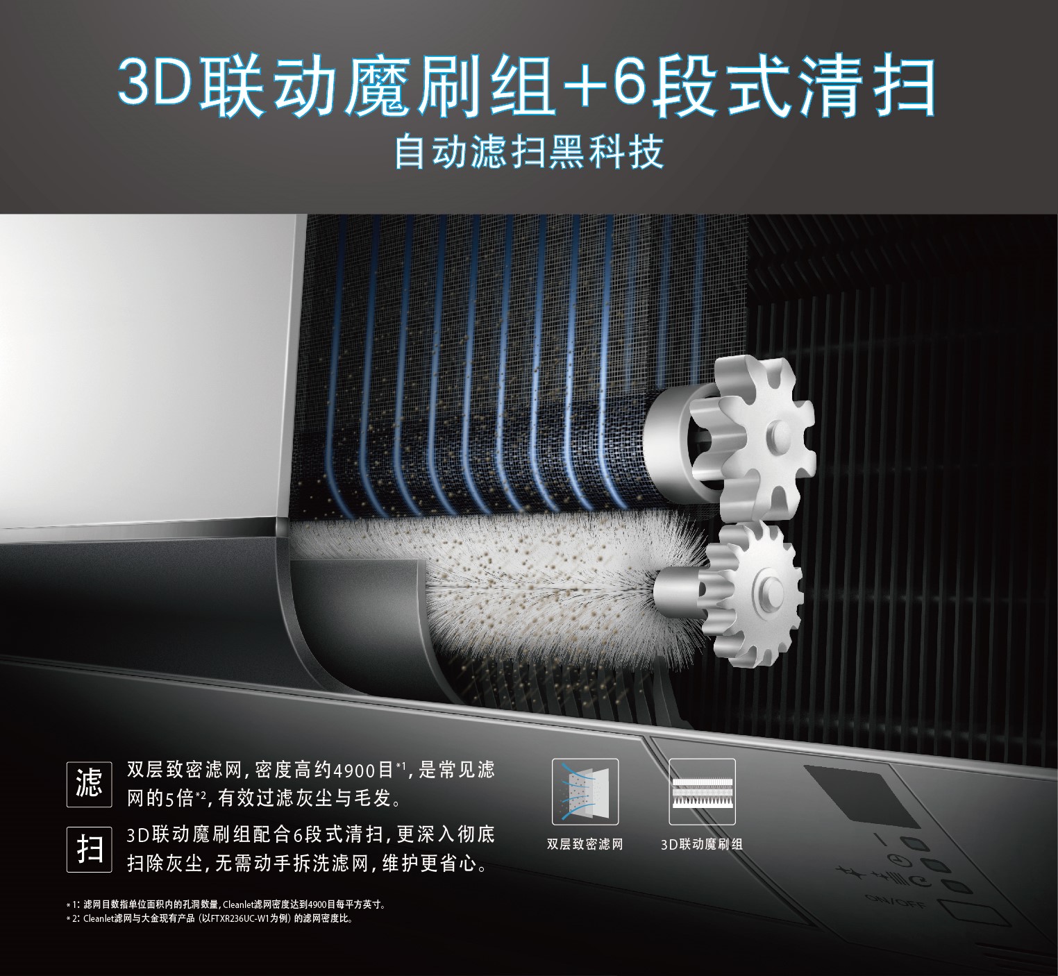 3D聯(lián)動魔刷組匹配6段式清掃,自動濾掃黑科技實現(xiàn)空調常用常新
